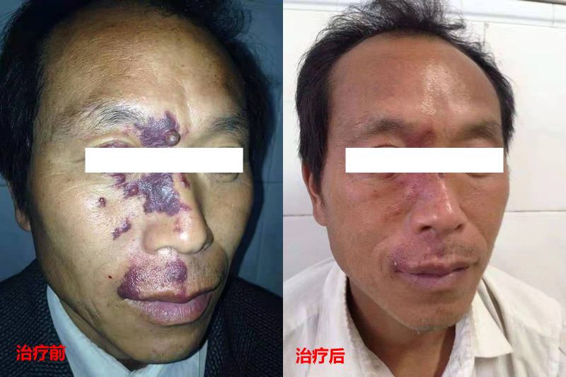 由于胎记黑素细胞位置较深。采用激光治疗,选择破坏黑色素细胞,治疗后颜色明显减轻,以达到治愈的目的。