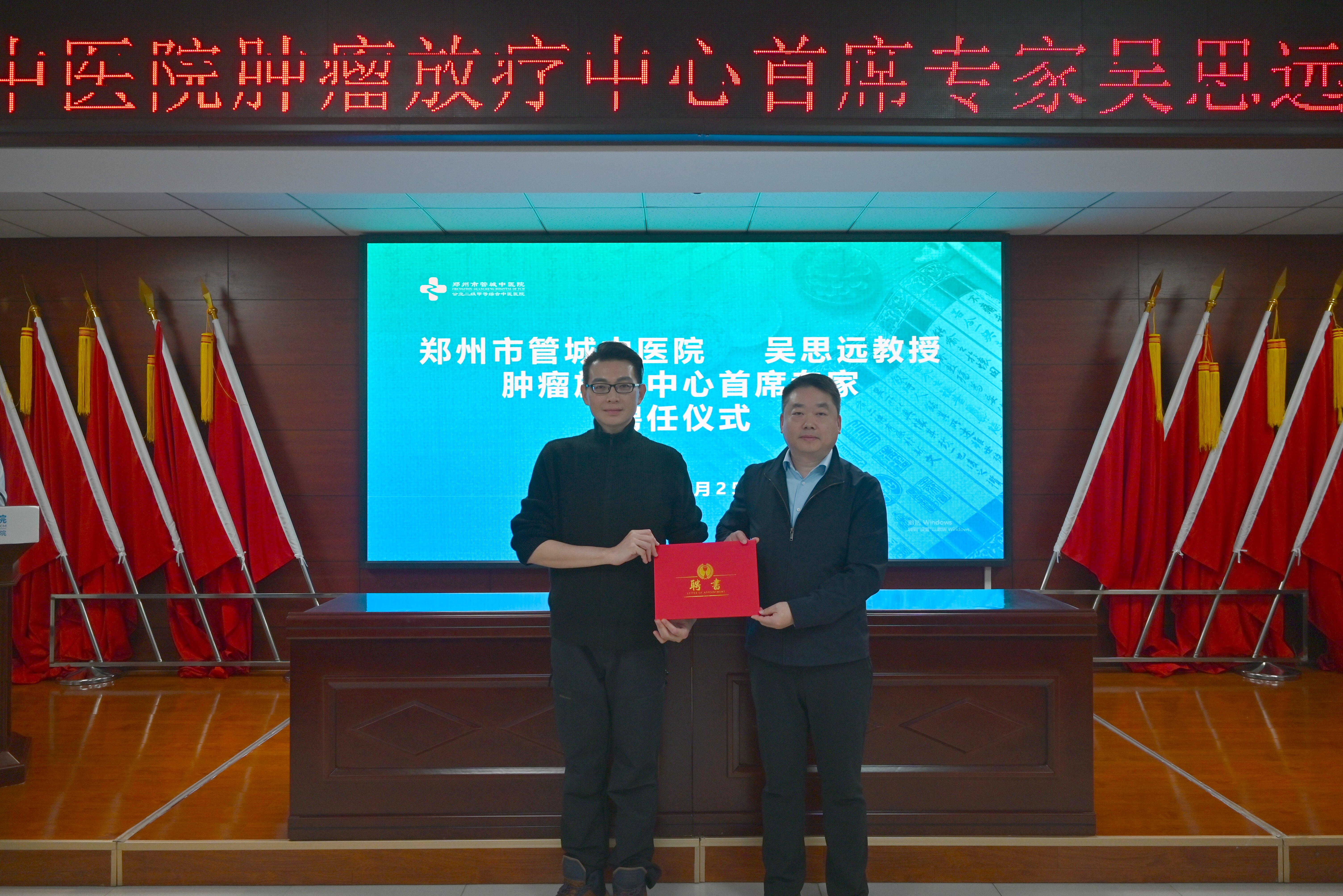 2026年1月25日,我院隆重举行聘任仪式,正式聘请享誉国际的医师科学家(Physician-Scientist)吴思远教授出任肿瘤放疗中心首席专家。我院党总支书记、院长李勇,副院长李琦、工会主席张磊、党总支委员龚欣欣、相关科室负责人参加仪式。仪式由副院长李琦主持。