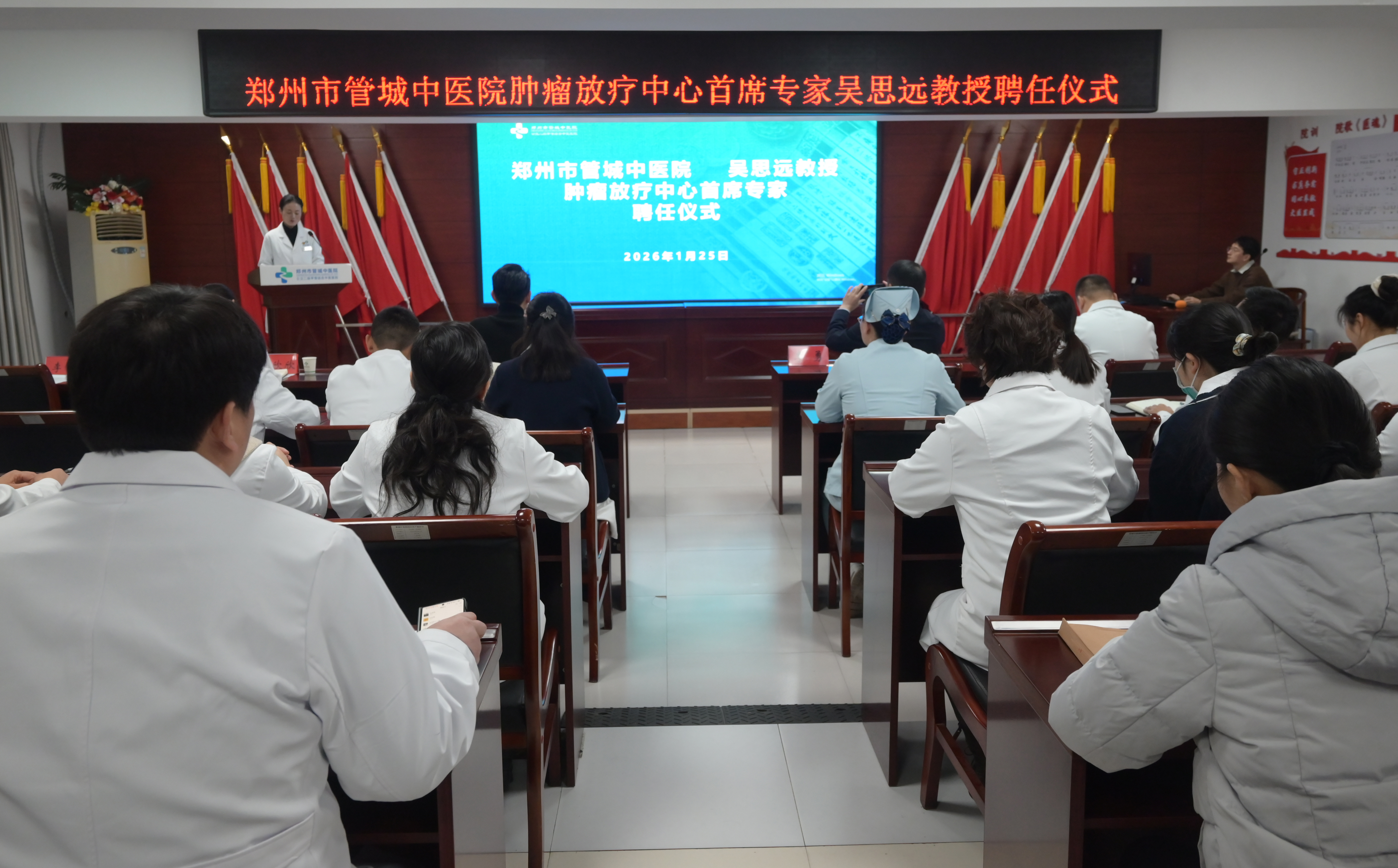 仪式上,吴思远教授阐述了其“四位一体”整合医学理念,涵盖微观纳米靶向治疗、先进影像技术、国际同步放疗及大数据与人工智能诊疗优化,并强调将为我院肿瘤放疗中心引入基于循证医学的精准放疗国际标准流程体系,实现全链条规范化与个体化治疗。同时,他提出构建以患者为中心的紧密协作型多学科诊疗团队,通过定期联合讨论、严格质控、持续培训及人文关怀,确保医疗细节达到最高标准,最终实现疗效最大化、副作用最小化与患者体验最优化。
